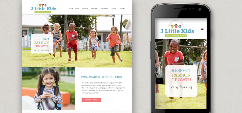 Website Design for a new preschool and early learning centre - 3 Little Kids in Australia. A fresh natural color palette for the young kids was incorporated in the logo and centre brandingd esigned by us . The client is very happy with the new website design. We worked on a clean modern attractive design and user friendly IA. The site is responsive and works well across mobile devices.