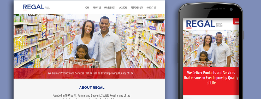 Regal Congo is one of the fastest growing companies in the Republic of Congo. Spanning across diverse industries such as supermarkets, stationary and office equipment, electronics and the import export and distribution of goods on a wholesale and retail level. They had a dated logo and website and needed a good web presence to match the real scale of business and connect with it's consumers, vendors and suppliers. The site is responsive and scales well on mobile devices. The Client is very happy with the new branding and website.